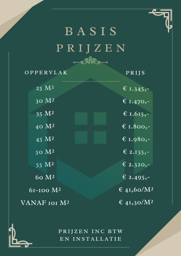 De bovenstaande tabel geeft basisprijzen weer voor het complete vloerisolatiesysteem, inclusief Thermoskussens en Bodemfolie. Prijsverhogende factoren, zoals moeilijke toegang, hoge of lage kruipruimte, leidingen, enz., kunnen van invloed zijn. Extra kosten voor opruiming kunnen ook gelden. De vermelde basisprijzen zijn richtlijnen, en afwijkingen zijn mogelijk afhankelijk van specifieke omstandigheden. Transparantie staat centraal, en we streven naar duidelijk overleg voor een passende prijsafspraak.